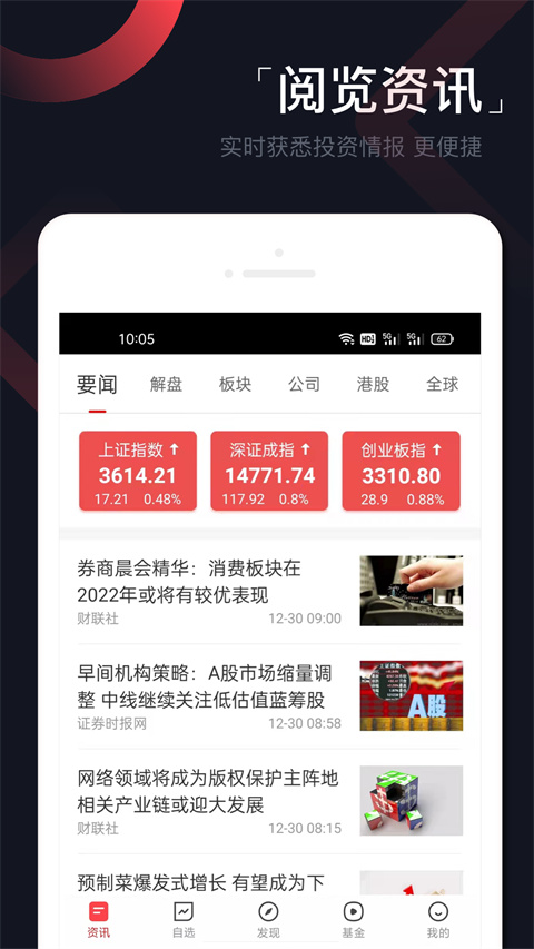 1、在【资讯】页可以看到要问、解盘、板块、公司、港股、全球相关最新推送动态;