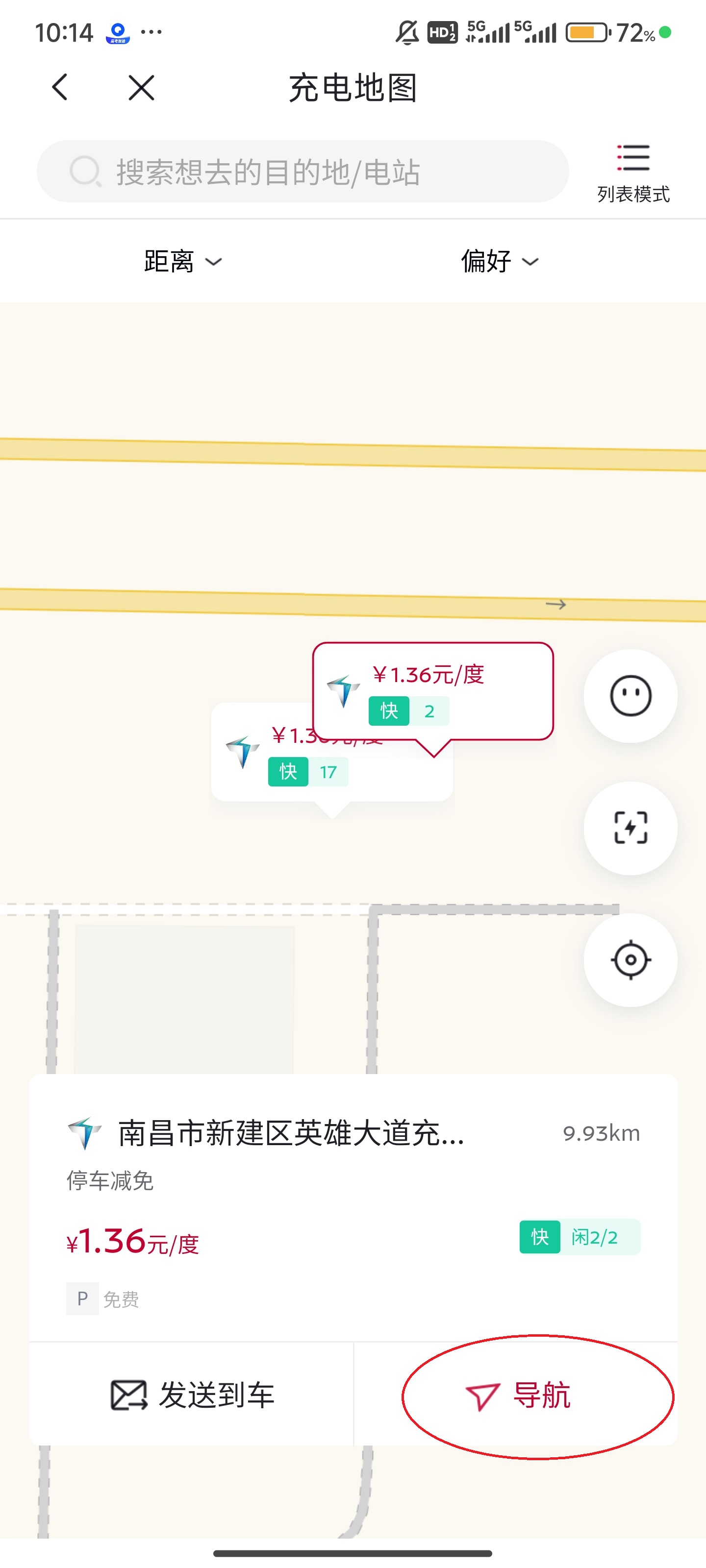 5、点击充电站后,点击右下角的“导航”或者左下角的“发送到车”就可以了。