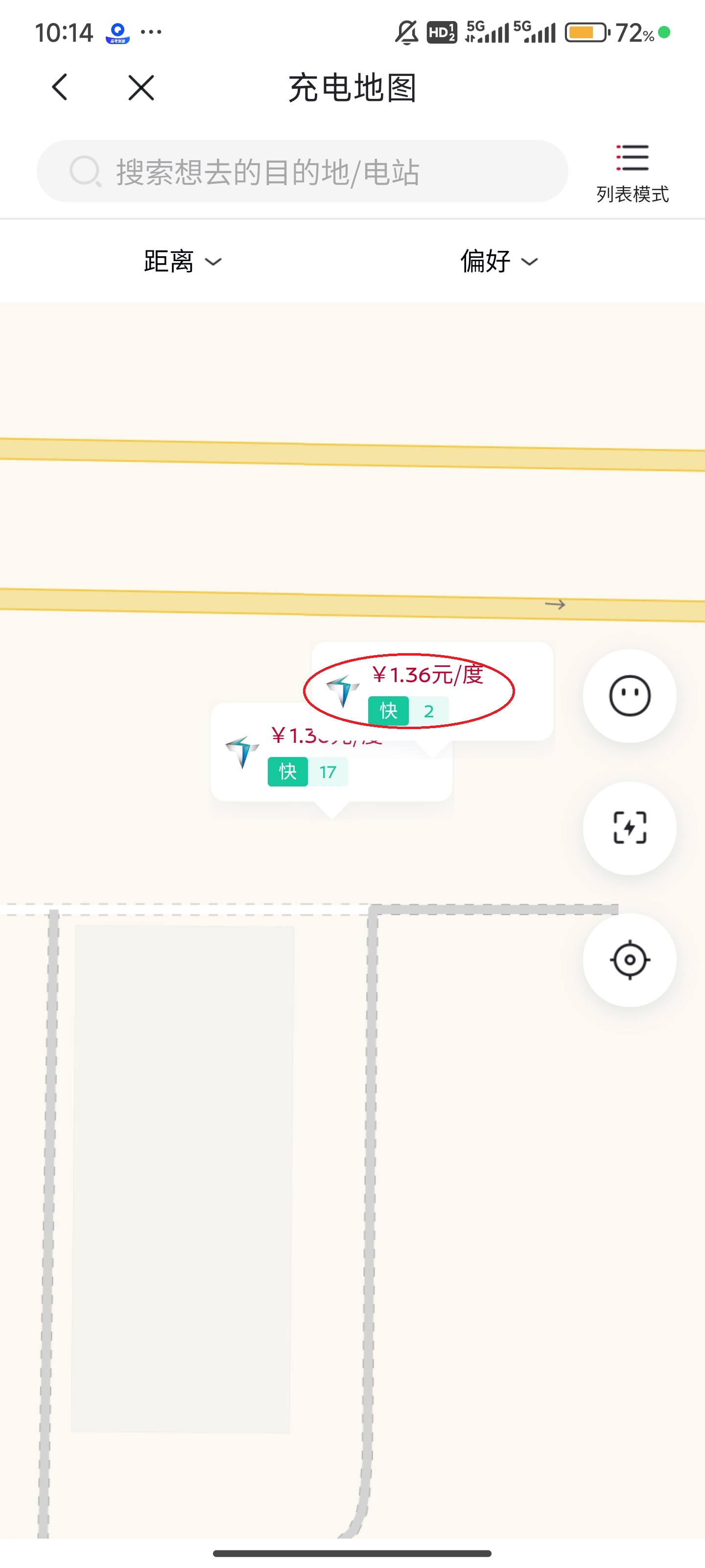 4、在地图上选择合适的充电站,可以看每度电多少钱,以及空闲充电桩。