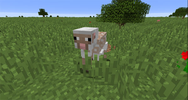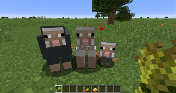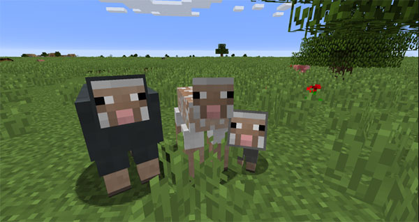 除了吸引羊群之外,小麦还可以用来促进羊的繁殖,羊的繁殖非常有趣——小羊会继承父母的羊毛颜色的一种,但如果父母的羊毛颜色是两种可以互相结合形成新颜色的品种时,小羊则会变成混合色,举例来说,灰色羊与白色羊可能生出浅灰色羊,正如图例。