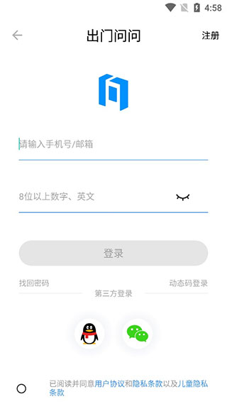 2、输入手机号或者微信QQ登录,首次使用先注册。