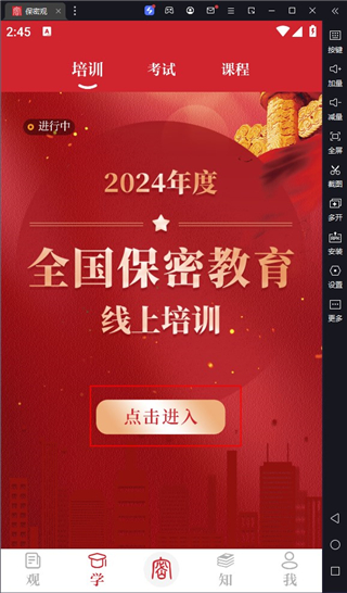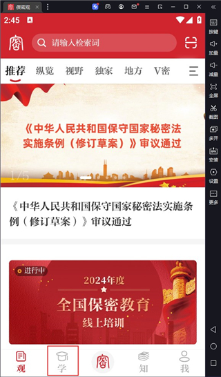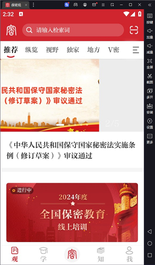 保密观电脑版是一款基于安卓模拟器运行的保密文化在线学习软件,该软件会及时发布有关国家秘密、工作秘密、商业秘密、个人隐私等秘密信息保护方面的新闻动态,并提供保密专业图书、期刊、音频、视频等内容丰富的保密专业资源。同时还提供专业教材、保密资料和视频课程等形式的在线学习,增强用户的保密意识和能力,使其更好地了解保密条例并应用于工作生活中。