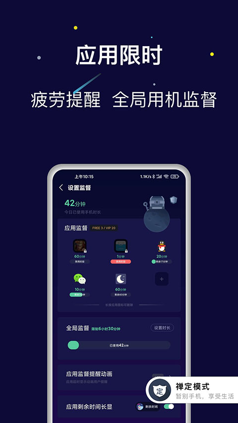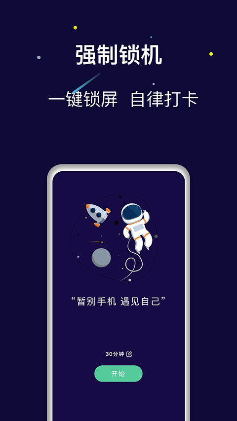 1、设置需要锁定的时间,开始选择开始后手机将进入锁定模式; 2、手机锁定后只允许接听电话和紧急拨号; 3、每次锁定的时间会帮助您进行记录; 4、全面的手机使用统计,您更了解自己的手机使用情况。软件亮点