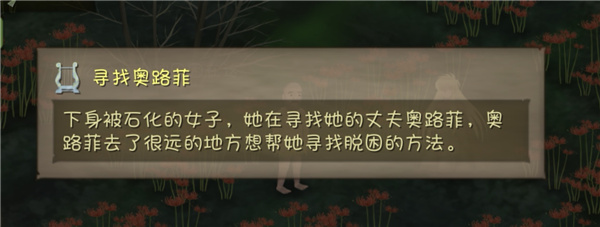 1,触发 步骤:在地图右边某处,周围有特殊的背景音乐,走近花丛,看到半石化的尤莉迪斯。走近,对话后,触发任务。