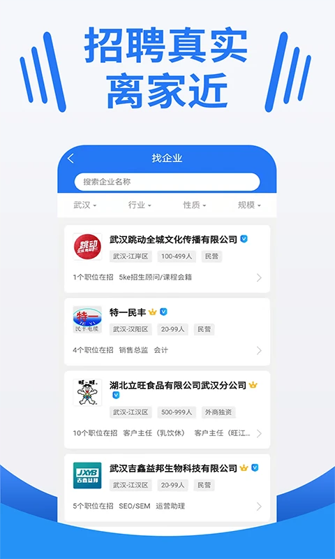 1、搜索职位 细分条件,层层筛选职位,帮助您轻松找 到称心如意的好工作。 2、附近职位 精准定位,让您走到哪、找到哪,随时随地 发现身边的好工作。 3、推荐职位 智能匹配,依据您的个人特点,为您量身 推荐最适合您的职位。 4、最新招聘 及时发布,帮您一网打尽最新招聘信息,抢先 一步发现新机会。更新日志