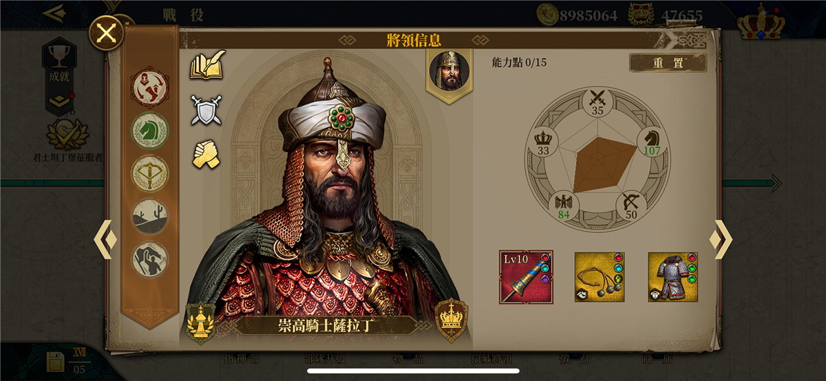机制将领,低氪玩家手中的战神之一。在欧7接连出了两位弓兵大将后,萨拉丁更加坚定地加入到了骑兵大队的行列中。主动技能强力,稳定触发2次额外攻击还是朴实无华的强,同时也弥补了专武没有兵种能力加成导致其能力数值不足的缺点;被动技能组加伤不够稳定。
