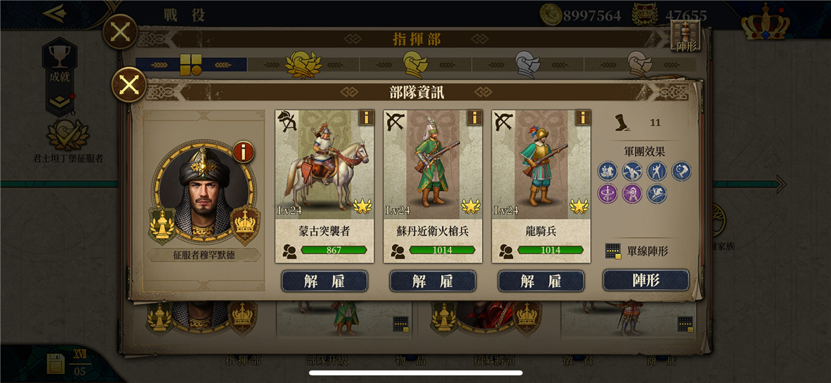 进阶:马穆鲁克弓骑兵/蒙古突袭者/抱式大筒队。阵型选择单线阵。