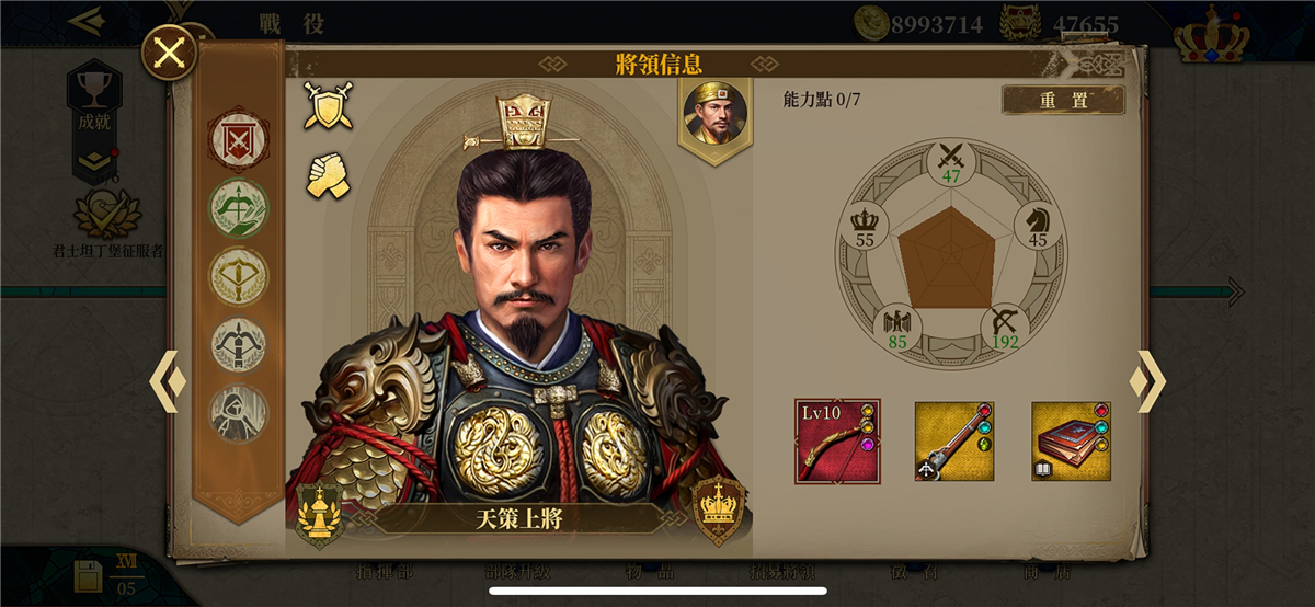 进阶三近骑模板,最贵($7.99)的特权氪金将领,将领传奇是重要的红色宝石产出来源之一。专兵转职后作为进阶三近骑体系之一。主动技能顶级,超强群体硬控;被动技能组加伤足够并且自带攻击减耗。