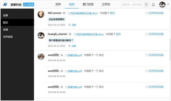 1、统一管理企业全部文件 通过客户端、自动同步、API、映射盘等方式把分散在组织各个设备中的文件统一上传到云端分权限管理。所有文件操作均有记录,防篡改有备份多版本,防止文件丢失或泄漏。 2、整个企业的工作空间 巴别鸟是面向企业推出的文档管理系统,企业工作文件保存在巴别鸟上,配合在线打开文档、同步端及其创新的讨论系统,企业成员可以在同一个文件上进行工作,并在任何设备上沟通和获取工作内容。