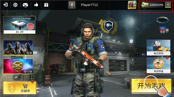 1、打开在本站下载的打击力量英雄,进入首页我们可以看到有阵营、排行榜、武器库等等功能板块,我们可以先点击齿轮状的设置键