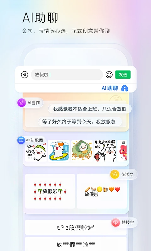 【YAN键盘】 颜/言/研新皮肤上线,多图轮播、文案百变,每次输入都有小惊喜; 【自定义皮肤】 超多素材,支持多图DIY、百变文案DIY; 【智能预测】 根据场景猜你想说,智能补全整句; 【AI智能输入】 自适应输入场景,出词更智能; 【AI语音输入】 支持中英混合免切换、方言免切换,更快更准确; 【离线语音】 断网弱网语音输入一样准; 【超大系统词库】 50万系统词库,输入流畅,选词准确; 【人工智能引擎】 智能整句输入算法加纠错算法,提高准确率; 【快捷搜索】 边聊边搜,一步直达; 【游戏键盘】 游戏短语、悬浮语音、和谐转换三大神器,助力上分、超神必备; 【懒人短语】 内置多个短语分类,并支持添加个人常用语; 【自动同步】 用户网络词、设置项、个性短语云端备份自动同步; 【超强中英混输】 中文、英文、数字、符号自由混输; 【智能手写】 支持叠写;边写边出字,识别速度快;毛笔字效果; 【超多输入方式】 支持拼音、英文、笔画、五笔、语音等多种输入方式; 【语音速记】 声纹区分角色技术首次在输入法登陆;更新日志
