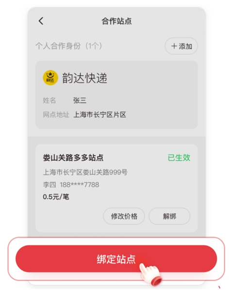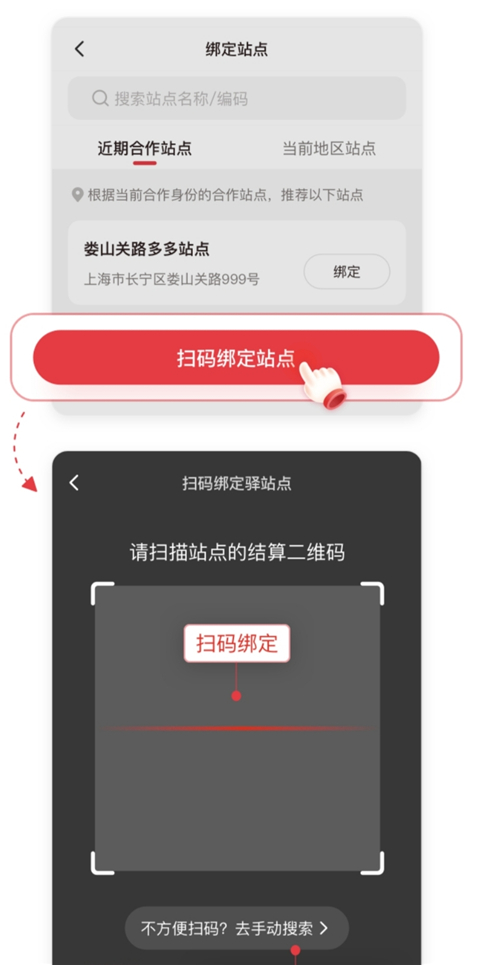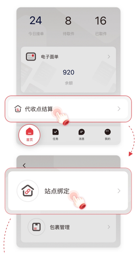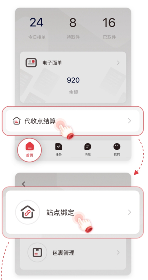 1、打开拼多多快递员版app并登录,先完成多多钱包的绑定,在首页点击【代收点结算】(首次使用需要完成实名认证),选择【站点绑定】。