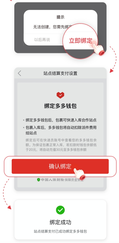 2、弹出提示窗口时,点击【立即绑定】→【确认绑定】,绑定多多钱包。