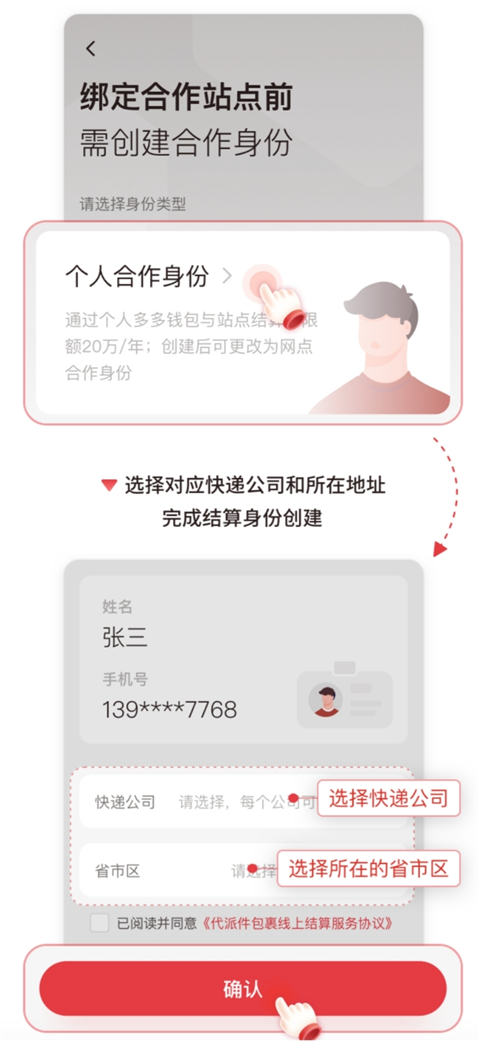 4、点击【个人合作身份】,选择对应快递公司和所在地址,点击【确认】完成结算身份创建。