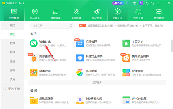 1、电脑体检 对电脑进行系统、软件等全方面的检查并告诉您哪出了问题。 2、查杀修复 使用360云引擎、360启发式引擎、小红伞本地引擎、QVM人工智能引擎四重引擎查杀病毒,同时对系统漏洞进行修复和常规修复。 3、电脑清理 清理无用插件、软件垃圾、浏览痕迹和无效注册表。 4、优化加速 加快开机速度,硬盘智能加速,同时对磁盘碎片整理。 5、功能大全 提供各式各样不同领域和用处的功能。 6、软件管家 更安全省心省力的下载软件。 7、办公工具 全新306AI办公上线。360安全卫士怎么拦截广告弹窗