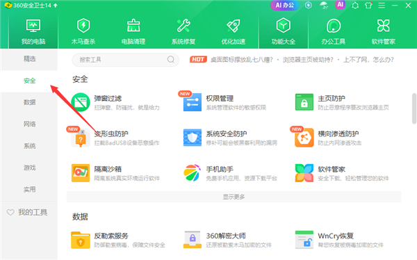 2、进入功能大全界面后,在左侧导航窗口找到安全,并点击。
