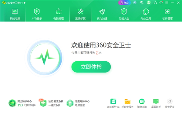 360安全卫士会对浏览器防护、系统防护、系统设置等系统、软件常见故障的九处地方进行检测,还能对插件、软件垃圾、系统垃圾、无效注册表等未清理干净的八项垃圾进行检测,同时检测是否有病毒、木马、漏洞等以及系统运行速度能否提升,并配合上360安全浏览器、360压缩等软件保护你不受任何侵害。新增全新306AI办公工具,助力用户在工作中提供更多的便利!