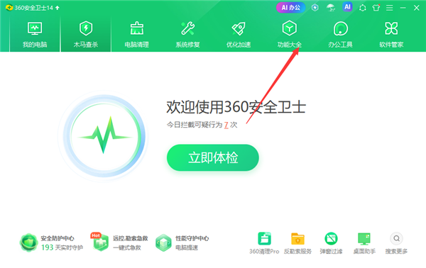 1、打开360安全卫士进入到主界面后,点击功能大全。