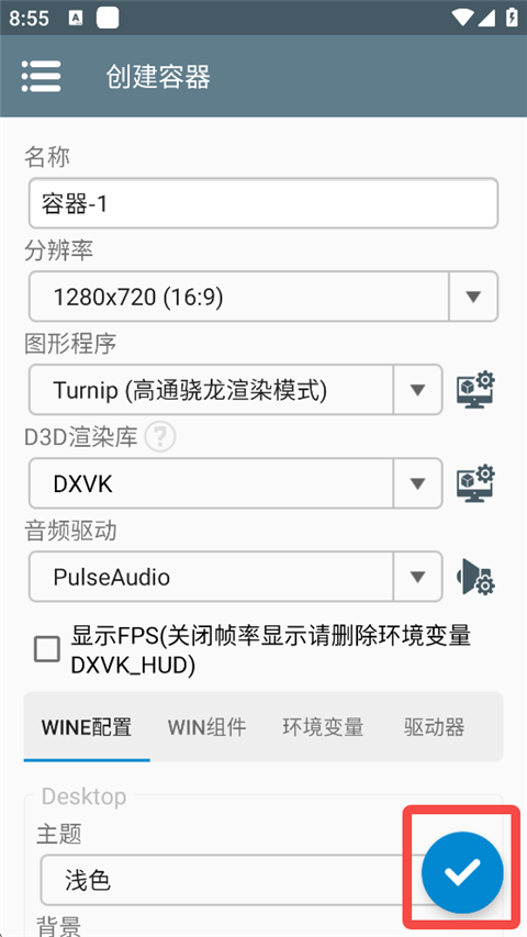 2、选择屏幕分辨率,以及设定显存大小(配置较低的手机显存和分辨率要小点),点击右下角√图标创建。