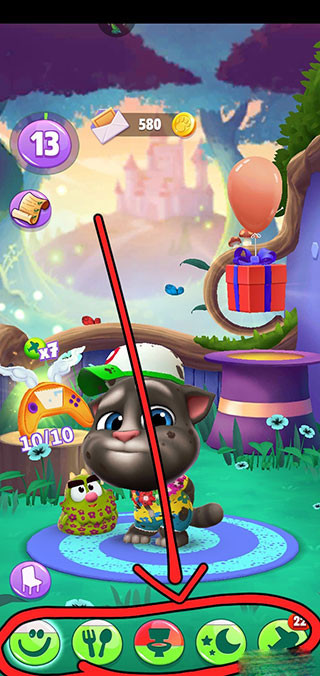 1、进入游戏首先我们能看到汤姆猫的脚下有一排共五个选项。