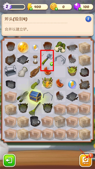 1、首先大家打开游戏可以看到庄园很乱,所以我们要开始整理,点击中间打钩的按钮。