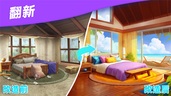 1、在三消改造益智游戏中装饰你的豪宅,三个同色抱枕排在一起就可以消掉;