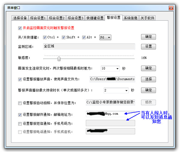 3、有人闯入时可以电脑播放报警声音、手机短信通知、电话通知等。