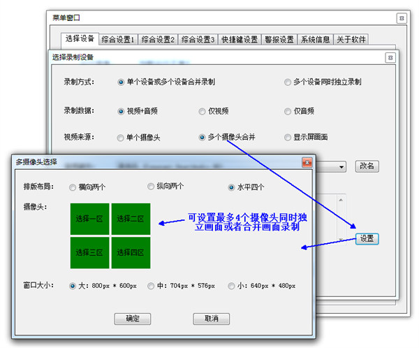 1、支持单个摄像头+多个音频设备录制、多个摄像头画面合并+多个音频设备录制、多个摄像头与多个音频设备各自同时单独录制等。