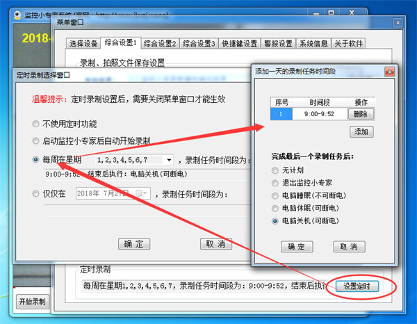 5、可指定一周内哪些天录制,且可指定-天内哪些时段开启或关闭录制。