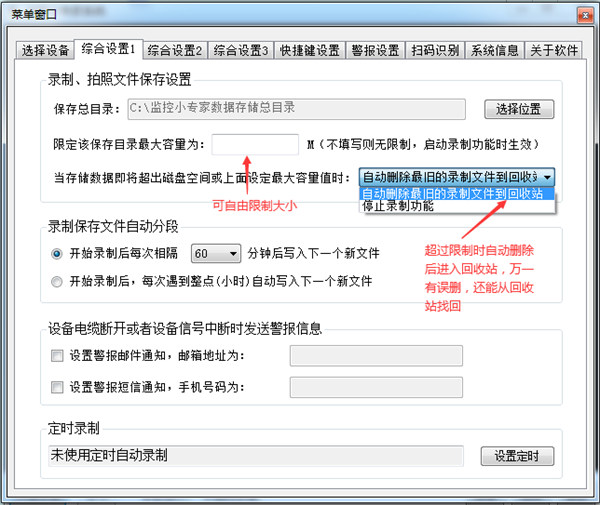 4、可指定保存目录占用最大空间,接近时及时自动删除最旧数据文件。