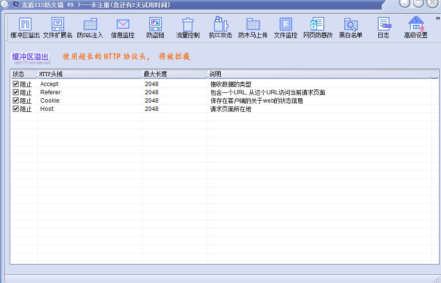 “龙盾IIS防火墙”允许您自定义HTTP头、URL地址 、COOKIE以及查询串长度, 防止缓冲区溢出攻击。