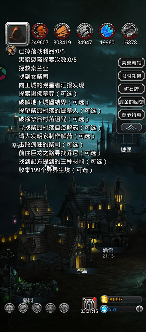 1、英雄选择(重点) 图16之前一队国家队:骑士,祭祀,法师,刺客。95%的场合都能打的过去。 其他的英雄别浪费金币,S也不买,酒馆出现SS的买了,不是这些职业就别用,集中资源堆这几位。 不要因为获得了什么好(其实也是垃圾)装备就去用别的职业,真的没用。 技能设置(以下为第一次转职名称): 圣骑士:始终嘲讽,60%治疗自己,85%治疗队友,攻击血最少的敌人。 神官:始终治疗,其他不开。 元素师:40%治疗自己和队友,大于2人群攻,单体攻击生命最低。 刺客:只选择开启13技能,攻击生命最低。 当攻略需要其他职业的时候,再去考虑培养其他角色。(其实前期基本不需要) 装备选择:前期有啥用啥,没啥挑的。但不要为了一把武器而去分散资源去培养一个用不到的角色(哪怕对方是SS) 2、金币用在哪里 婴儿期(图14之前):优先购买食物/木材/铁。 幼儿园(图15~17):在家园升级差不多之后,疯狂购买食物和铁,少量购买水晶和秘银。 小学:(图18):5种资源,都买(优先级取决于你需要什么)(到时候你自己就知道你自己需要什么了) 3、每日副本 图3裁判所,刷银骑士之盾(核心),8个。 图5:裂隙,每日5次,冲击高层,查攻略。 图7幽谷:刷幻视魔粉,越多越好。 图7战力测试:打木桩,请选择你输出最高的4个职业,尽可能的爬高。 图8远山庄园:刷魔力之靴x4,燧火之衣设计图。 图11谢福的墓葬:刷迅捷之靴(***根本没有,我到现在连这个副本都没开,直接用强者碎片到图14换) 图13:漆黑之血,黑骑士转职材料,15人份,同寒霜秘术残页。 图14训练营:刷寒霜秘术残页,15本,3人转职量,第一人份不用不行,第二人份属性优异,第三人份追求极品。 图14右边:NPC头像小怪,附魔典籍,剑魔转职材料,可有可无。 图15迷宫:蓝宝石戒指*2,然后魔晶挂坠*3,然后蓝宝石戒指*2,然后准备40+个天然蓝宝石和魔化钢为制作魔化蓝宝石戒指做准备。宝箱没必要拿。 图16迷雾岛:月冕法杖/战斧/圣锤/胫甲,堕落臂章x3,然后光铸天国束带x4,然后堕落臂章x3,其他装备可以不拿,更多装备可以接着刷没人拦你。 主城遗迹:冲击高层,查攻略。 4、建筑发展选择 酒馆升级至30级,在此之前不要为了SS英雄而浪费金币去刷新。因为SS英雄刷新概率会在30级时达到最高的0.3%,之后不会再提升。 酒馆30级的过程中,英雄升星的过程中需要工坊对应等级解锁的徽章,那个时候再去升级工坊。 酒馆30级之后,工坊升到30级满级,之后优先酒馆飙升到48级,为月100级英雄做准备。 仓库推荐,食物木材铁100万,水晶秘银30万,以后再提升。 5、锻造 锻造会影响你装备的属性,直接影响你的实力,制造任何东西都会增加熟练度,但是用铁直接锻造装备的性价比最高,没有之一! 每5级提升护甲与抗性上限,要锤防具和银骑士之盾与其他护甲/抗性装备的,请先把手剁掉 ,过了这个等级接上再锤。 6、材料 前期最容易缺少的就是稀土和强者血液,获取方式有三种: -金币商店买,这没啥说的。 -地图上挖矿得稀土,杀怪和迷路英灵获得强者血液。三、在进行“丢失的贝拉”任务过程中,在大发明家那里可以用一些怪物掉落的没用材料来随机换取有用的材料,其中也包括稀土和强者血液。 而当你到达中期的时候,最需要的是击杀迷路英灵获取的英灵祷言,两种获取办法: -刷图14.15.16的迷路英灵,一张图5队。 -教会捐献。更新日志