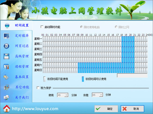 1、控制使用电脑或上网的时间,家长可以选择一周7天,每天24小时内,限制子女只能在指定时间段内使用计算机(或指定时间段内联网),超过使用时间后,电脑将不能再继续使用(或无法联网)。2、保护孩子视力,家长可以通过定时休息功能,规定孩子每使用一定时间后,必须休息一段时间,以达到保护视力的目的。