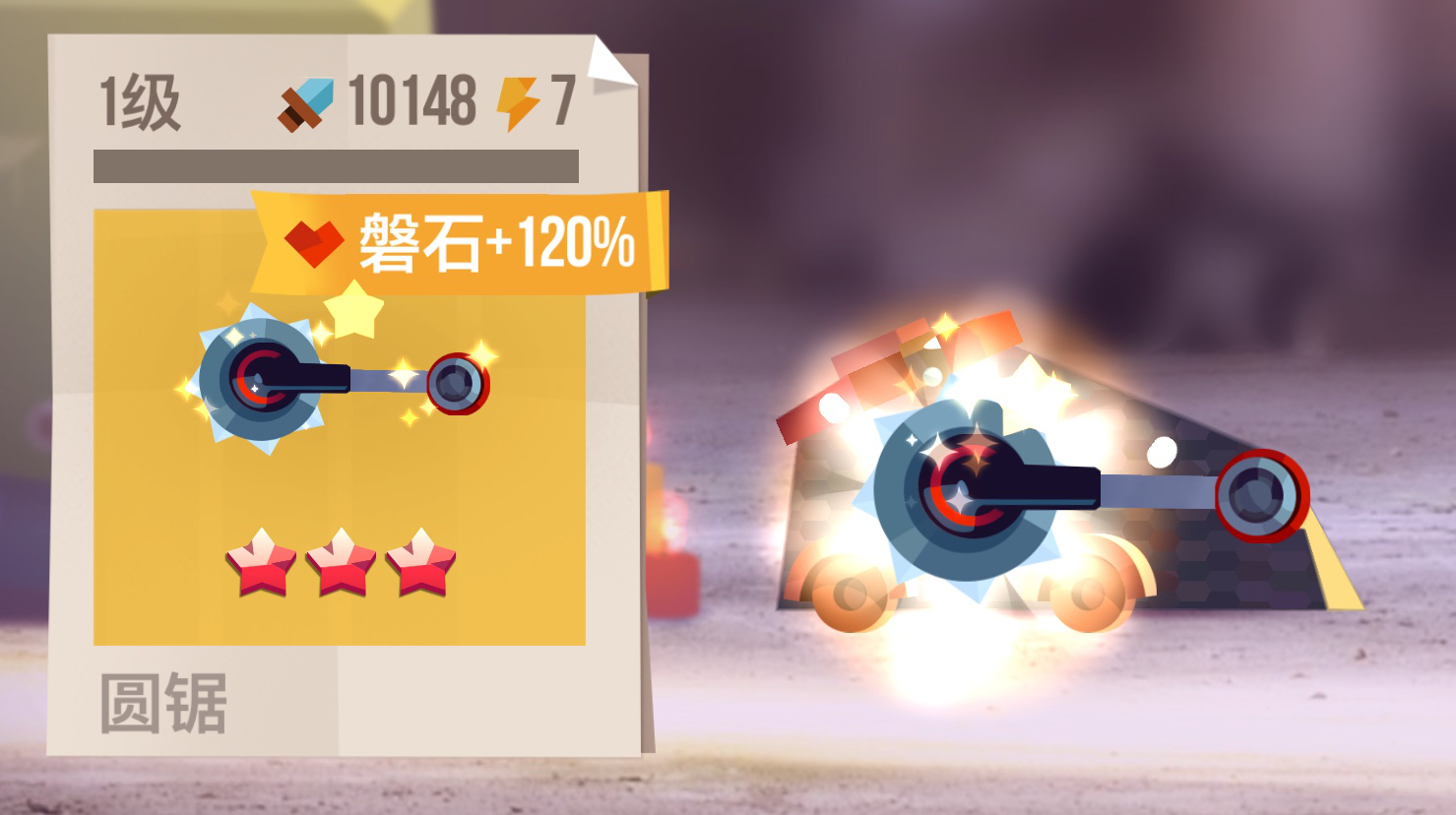 这里把火箭射速当作绝对的1s来进行比较,所说的“武器攻击力”全部指的是武器自身的攻击力,面板伤害减去工具箱(技能点、部件属性附加的都是武器自身攻击力)。 武器相同战力时(可附带工具箱),平均每单位时间伤害比较:圆锯>火箭=双管火箭>激光 攻击类武器: 1、圆锯: ★ ★ ★ ☆ ☆ 实际伤害=武器攻击力+工具箱 攻击间隔≈0.85s(一圈) 评价:360度无死角,伤害稳定。 适用于飞车或者前喷车身(不推荐,克制流)。