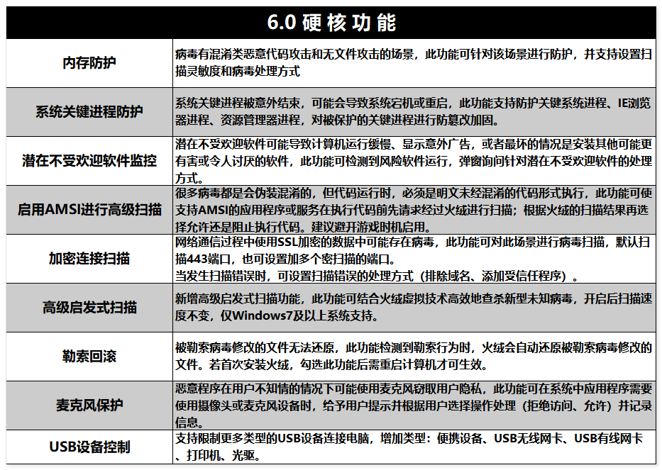 火绒安全软件6.0基于目前PC用户的真实应用环境,考虑到用户所面临的各种威胁和困境,再次升级反病毒引擎等核心技术,推出9大硬核功能,可有效解决无文件攻击、系统进程保护、流氓软件等诸多安全问题,为“杀、防、管、控”增强壁垒。