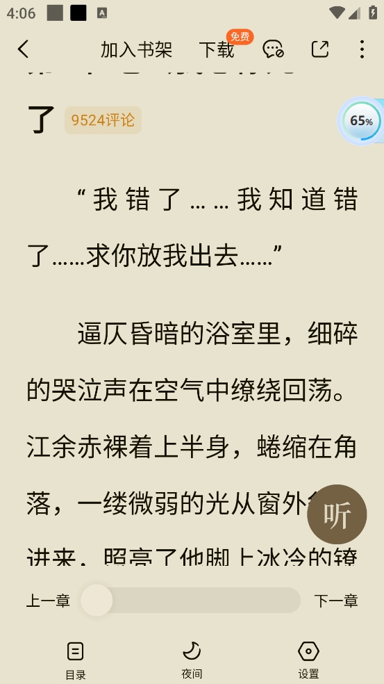 2、来到小说阅读界面,点击小说中间区域即可弹出菜单,接着点击右下方的“听”字按钮。