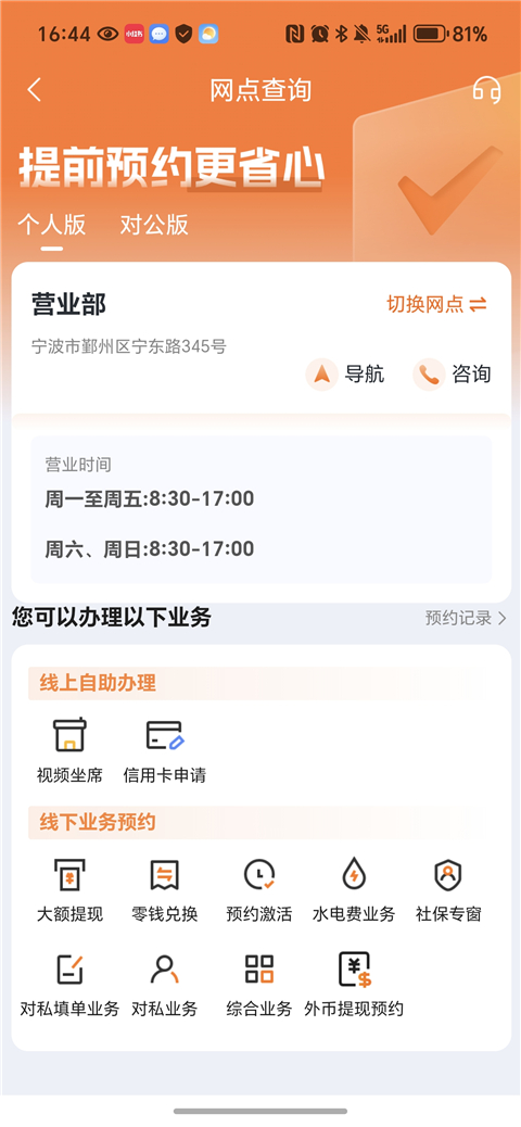 3、点击后,即可查看附近网点信息,还能进行预约。