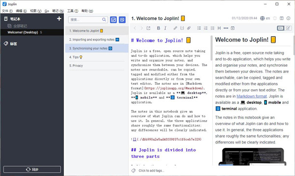 Joplin(桌面云笔记软件)是一款开源的笔记和待办事项的应用程序,软件可以处理笔记本中组织的大量笔记,支持Markdown格式,可以直接从应用程序或您自己的文本编辑器中复制、标记和修改,页面简洁美观,功能强大。Joplin支持桌面和移动端,可用于Linux、Windows、macOS、Android和iOS,软件主要功能包括端到端加密,Markdown支持以及通过NextCloud、Dropbox、OneDrive或WebDAV等第三方服务进行同步;Joplin中文版可以处理组织成笔记本的大量笔记,支持桌面和移动端,笔记是可搜索的,可以从应用程序直接或从您自己的文本编辑器复制、标记和修改,还提供多种网盘同步功能,并且迁移数据很容易,如果你改变主意,也很容易从一种服务切换到另一种服务,有兴趣的小伙伴快来下载体验吧!