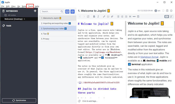 1、桌面、移动和终端应用程序 2、Firefox和Chrome的Web裁剪器 3、端到端加密 4、注意历史 5、同步各种服务,包括NextCloud,Dropbox,WebDAV和OneDrive 6、导入Enex文件(Evernote导出格式)和Markdown文件 7、导出JEX文件(Joplin导出格式)和原始文件 8、Joplin中文版支持笔记、待办事项、标签和笔记本 9、转到任何功能 10、根据多个标准对笔记进行排序——标题、更新时间等 11、支持警报在移动和桌面应用程序 12、首先离线,因此即使没有互联网连接,设备上的所有数据也总是可用的 13、Markdown notes,在桌面和移动应用程序中使用图像和格式呈现,支持额外的功能,如数学符号和复选框 14、文件附件支持,显示图像,并链接其他文件,可以在相关的应用程序中打开 15、搜索功能 16、地理定位的支持 17、支持多种语言 18、外部编辑器支持,打开笔记在您最喜欢的外部编辑器软件特色