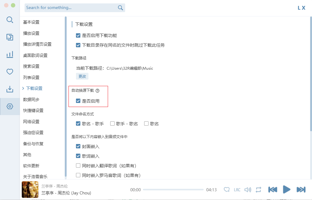 3、勾选启用下载功能,同时也可以更改下载路径,方便找到下载的音乐文件