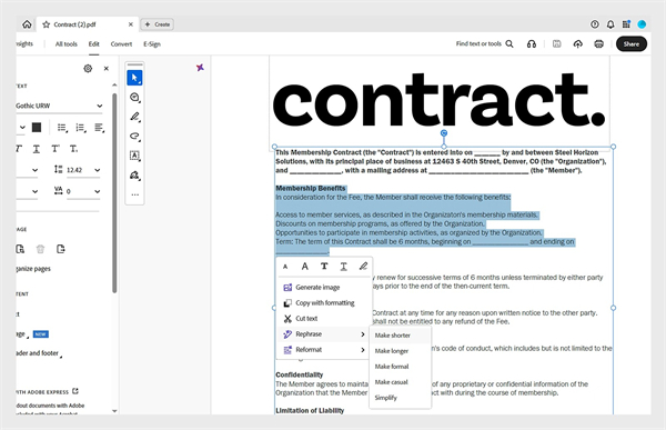 1、使用 AI 助手智能编辑文档 现在,您可以使用 AI 助手更快、更高效地编辑和改进文档。选择内容并从改写选项中进行选择,例如缩短/扩写文本、使用正式/非正式语气,或简化文本。您还可以立即将内容重新格式化为项目符号、列表或段落。每条建议生成后,您可以点赞、点踩或重新生成结果。