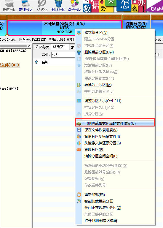 如果能确定您要恢复的数据存在于哪个分区上,那么直接在DiskGenius主界面上方的硬盘分区图中,选中分区,点击鼠标右键,然后在弹出的快捷菜单中,选择菜单项“已删除或格式化后的文件恢复”,如下图所示: