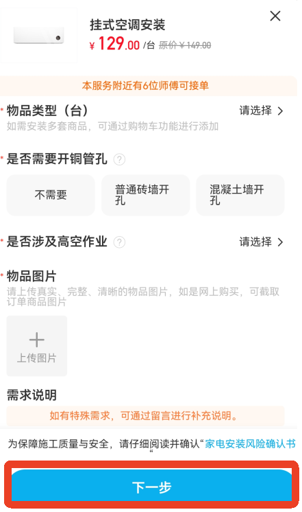 5、填写安装空调的相关信息,类型、是否开孔、是否涉及高空作业等等。填写完毕点击【下一步】。