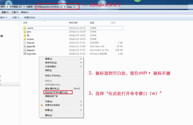 360加固助手支持命令行方式,即在命令行输入相关命令可执行加固应用、导入签名信息、导入多渠道配置信息等操作。 操作流程如下: 1、打开命令行窗口,并找到360加固助手当前目录。在jiagu文件夹下按住shift键,右键菜单选择“在此处打开命令窗口(W)”即可调出命令窗口(也可在开始菜单运行cmd)(见下图):