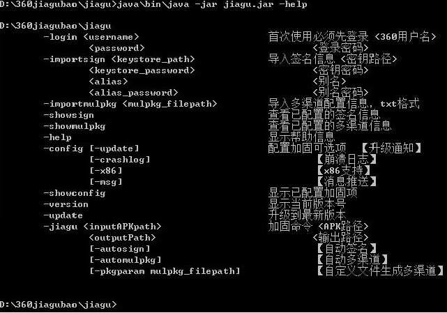 7、加固应用“java\bin\java -jar jiagu.jar -jiagu<inputAPKpath><outputpath> -autosign -automulpkg”