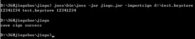 4、导入签名信息,在命令窗口输入“java\bin\java -jar jiagu.jar -importsign<keystore_path><keystore_password><alias><alias_password>”