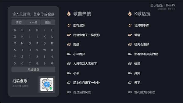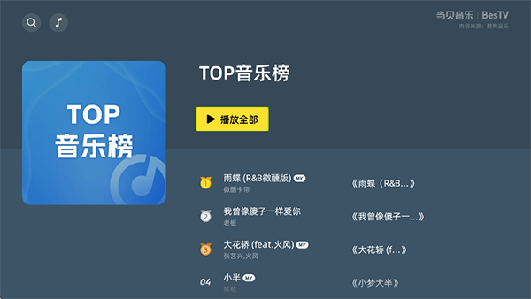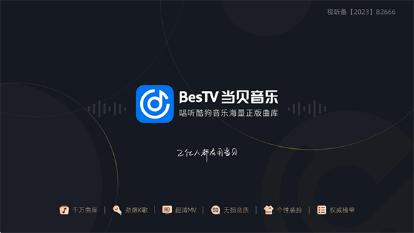 1、原创蝰蛇音质,满足不同场景需求 在音质方面,酷狗TV版支持精心调配过的原创蝰蛇音效。这种由蝰蛇专业打造的智能均衡环绕音,目前共有6款音效,包括专注细节的纯净人声、带来电影院般听觉享受的5.1全景音效、演唱会效果的Hifi现场音效、运用VR技术的3D旋转音效等等。作为酷狗独创的一款黑科技,蝰蛇音效通过各类垂直细化音效将大众带进听歌的专业领域,不仅提供多种高品质的听觉享受,还满足不同的场景需求。 2、丰富音乐场景,一键随心同步音乐资源 酷狗倾心打造的酷狗音乐TV版,不仅丰富了音乐使用的场景,还可随心一键同步手机版酷狗音乐的资源,让你轻松大屏幕畅想音乐的盛宴。因此,用户只需保证安卓TV设备连接网络后,进入电视机应用市场搜索酷狗音乐,便可找到酷狗音乐TV一键轻松安装。如果手机已有酷狗音乐APP,还可以轻松一键扫码登录,登录后便可在电视直接同步酷狗手机账号,轻松同步管理本地歌曲同步的内容众多,包含单曲、专辑、歌单、歌手、MV等,稳坐家中,便可以充分利用电视大屏幕优势,欣赏高清的MV视频,享受极致的观赏体验。当贝音乐tv版安装方法: