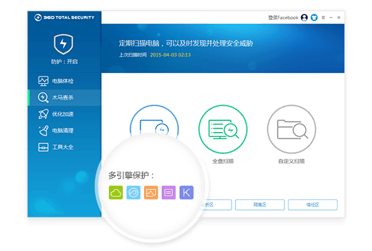 快速扫描电脑,内置360云查杀引擎、360 QVMII人工智能引擎、QEX脚本查杀引擎和鲲鹏扫描引擎,为您的电脑提供完善的安全防护。