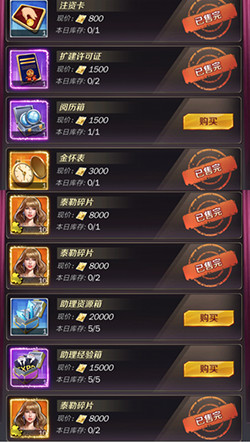 2、商会商店里,泰勒碎片和扩建许可证是每日必买的,其次是注资卡和金怀表,这里的助理资源箱性价比不高,不建议购买。