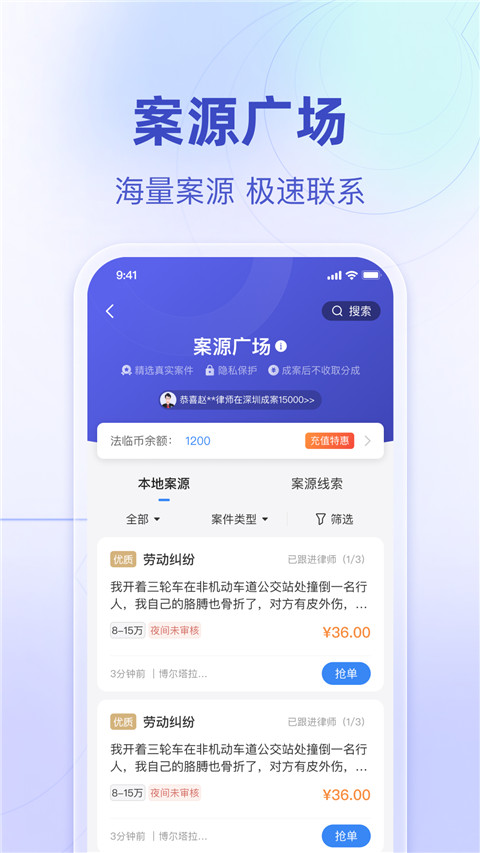 【案源广场】 海量案源实时更新,当天入驻立即接案,精准筛选匹配需求,打你擅长的官司。 【问答广场】 万千真实问题求助,一对一直接在线联系,线上公开文字解答,提升律师品牌曝光 【付费咨询】 当事人1对1付费求助,随时随地电话联系,高效接案增加收入,成案无任何分成。 【协作广场】 全国案件协作平台,免费发布各类异地案件协作需求,线上协作办案,提高工作效率。 【案源推送】 本地新增案源实时消息提醒,支持自定义消息推送设置,满足个性化提醒需求法临律师端App相关问题
